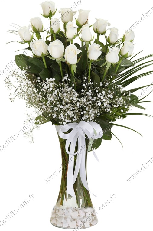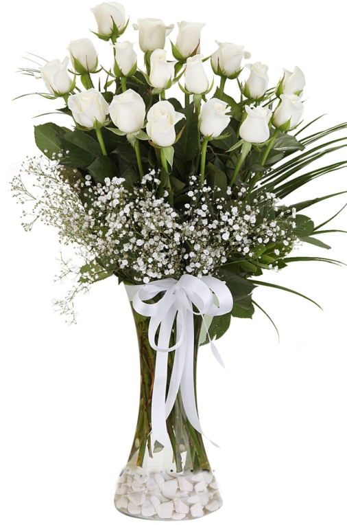17 Beyaz Gül Cam Vazoda, Birinci sınıf kalitede çiçekler kullanılmaktadır.