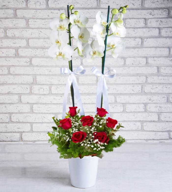 2li beyaz orkide içine canlı 7 kırmızı gülden hazırlanmış şık bir aranjman.