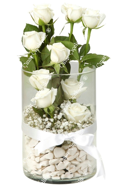 Cam Vazoda 9 Adet Beyaz Gül, Birinci sınıf kalitede çiçekler kullanılmaktadır.