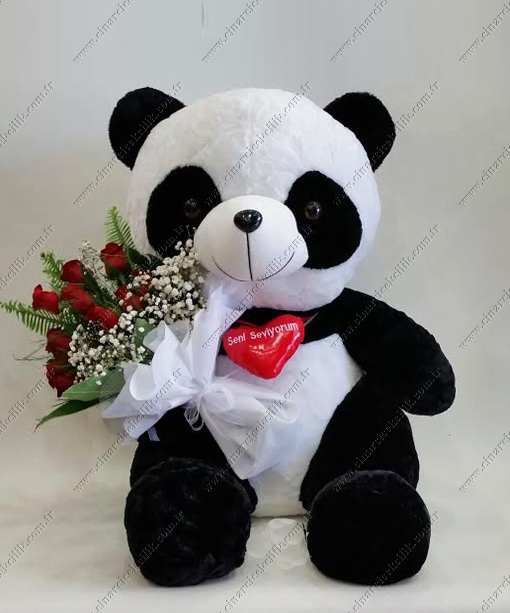 Oyuncak panda elinde 13 adet kırmızı gül ile aşkınızın her zaman yanında.