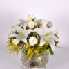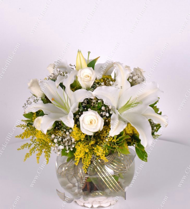 ‘Aşk Kokusu’ Kokulu Lilyum Gül Aranjmanı. Yaşadığınız bu dünyada seviyor ve seviniyorsanız sizden daha mutlu insan olamaz. İşte bu Sevgiyi bazen kelimelerde ve sözcüklerde ararız. Sözcüklerin bittiği yerde sevdiklerinize en güzel hediye şık cam fanus içerisinde beyaz Lilyum, 5 adet beyaz gül, ve çiçeklerinden oluşan şık bir aranjmandır.