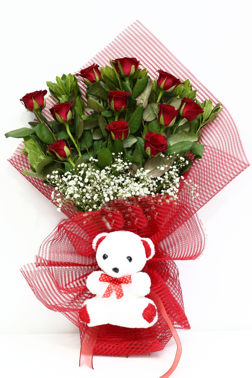 Kırmızı beyaz tül içinde 11 adet kırmızı gül ve oyuncaklı buket. Birinci kalite kırmızı güller ve oyuncak ayı ile hazırlanmış bu büyüleyici gül buketi, sevdiklerinize hediye ederek onlara güzel bir sürpriz yapabilirsiniz.