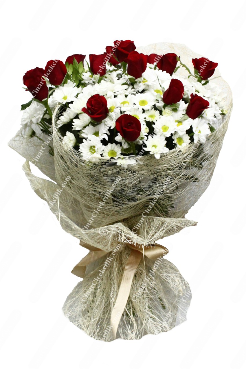 Abaka tül içinde 21 adet kırmızı gül ve papatya buketi. Birinci kalite kırmızı güller ve papatya ile hazırlanmış bu büyüleyici gül buket, sevdiklerinize hediye ederek onlara güzel bir sürpriz yapabilirsiniz.