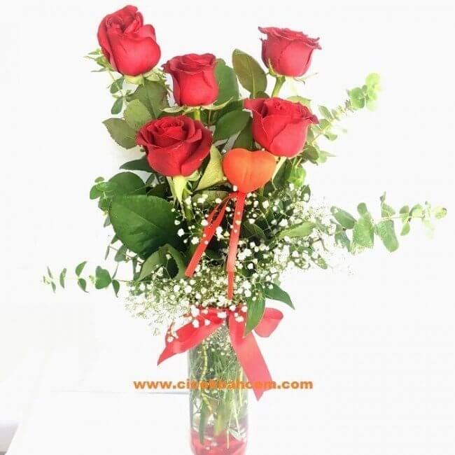 "Kalbim Seninle'' Kalp Vazoda 5 Kırmızı Gül