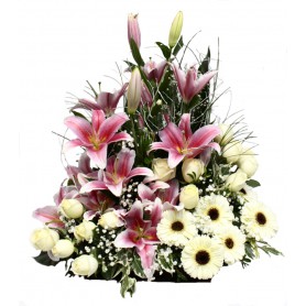Muhteşem olarak adlandırdığımız çiçeklerden oluşan bu aranjman ile sevdiklerinize tutkuyu, sevgiyi mutluluğu ve en güzel kokuları gönderin. Beyaz gül sevdiklerinize sunduğu zarafet ve güven duygusunun yanında pembe kokulu lilyum ve gerbera çiçeklerinin o muhteşem görüntüsü ile onları ne kadar çok değer verdiğinizi ve sevdiğinizi gösterin.