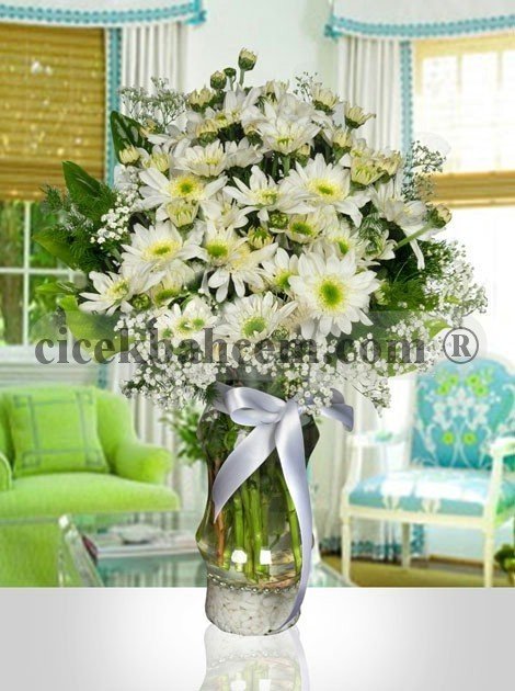Cam vazo içine beyaz dekoratif taşlarla süslenmiş beyaz kasımpatı tasarımı. Doğum Günü çiçeklerinden beyaz kokulu çiçeklerle sevdiklerinize göndermeniz için size özel çiçekler ile hazırladık.