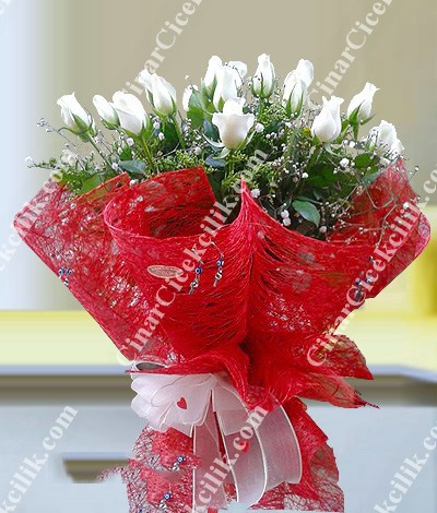Kırmızı tül içinde 11 adet Beyaz gül buketi. Birinci kalite beyaz güller ile hazırlanmış bu büyüleyici gül aranjmanı, sevdiklerinize hediye ederek onlara güzel bir sürpriz yapabilirsiniz.