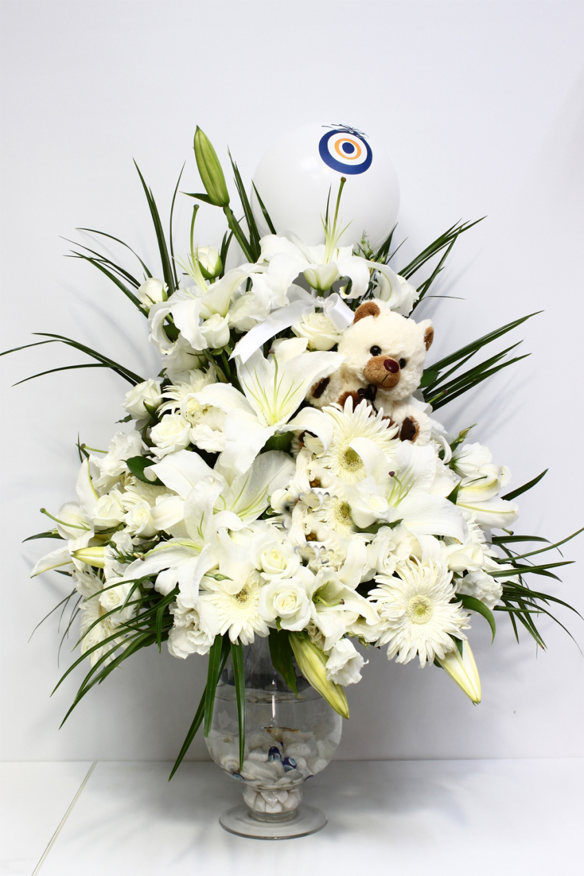 ‘Beyaz Düş’ Beyaz Çiçek Aranjmanı. Yaşadığınız bu dünyada seviyor ve seviniyorsanız sizden daha mutlu insan olamaz. İşte bu Sevgiyi bazen kelimelerde ve sözcüklerde ararız. Sözcüklerin bittiği yerde sevdiklerinize en güzel hediye şık cam vazo içerisinde Oyuncak Ayı, Lilyum , 21 adet beyaz gül, lisyantus ve gerbera çiçeklerinden oluşan şık bir aranjmandır.