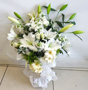 Beyaz tül içinde 7 adet beyaz gül, gerbera, kokulu lilyum, şebboy buketi. Birinci kalite beyaz gül, lilyum, şebboy çiçekleri ile hazırlanmış bu büyüleyici karışık beyaz buketi, sevdiklerinize hediye ederek onlara güzel bir sürpriz yapabilirsiniz.