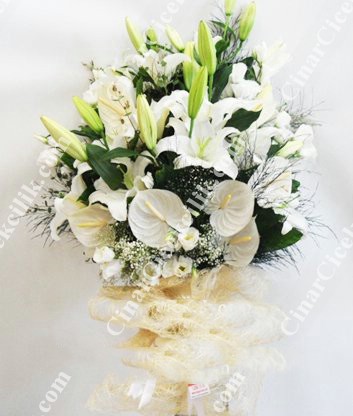 Beyaz tül içinde beyaz lilyum, lisyantus, antorium buketi. Birinci kalite beyaz lilyum, lisyantus, antorium ile hazırlanmış bu büyüleyici buketi, sevdiklerinize hediye ederek onlara güzel bir sürpriz yapabilirsiniz.