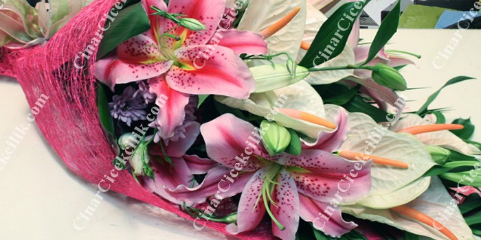 Pembe lilyum çiçeklerinin ihtişamı ile bu karşı konulmaz güzel antorium çiçekleri ile bir adım yukarı taşıyın. Bukette kullanılan bu iki özelliği en güzel biçimde gözler önüne seren bu özel buket özel günlerde çiçek gönderimi için birinci kalite kır çiçekleri, sevdiklerinize buket siparişi verip, buket gönder menin keyfe dönüştüğü çiçekçi.