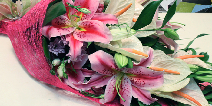Abaka tül içine kokulu pembe lilyum ve beyaz antorium çiçekleri ile hazırlanmış yatay çiçek buketi. Birinci kalite antorium çiçekleri ve pembe kokulu lilyum ile hazırlanmış bu büyüleyici yatay çiçek buketi, sevdiklerinize hediye ederek onlara güzel bir sürpriz yapabilirsiniz.