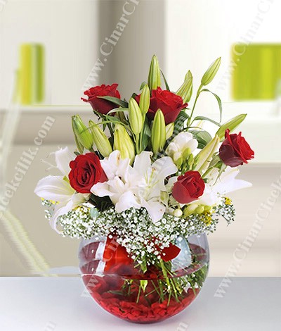 ‘Güzel Aşkım’ Cam Fanus Lilyum Gül. Yaşadığınız bu dünyada seviyor ve seviniyorsanız sizden daha mutlu insan olamaz. İşte bu Sevgiyi bazen kelimelerde ve sözcüklerde ararız. Sözcüklerin bittiği yerde sevdiklerinize en güzel hediye şık cam fanus içerisinde beyaz Lilyum, 5 adet kırmızı gül çiçeklerinden oluşan şık bir aranjmandır.