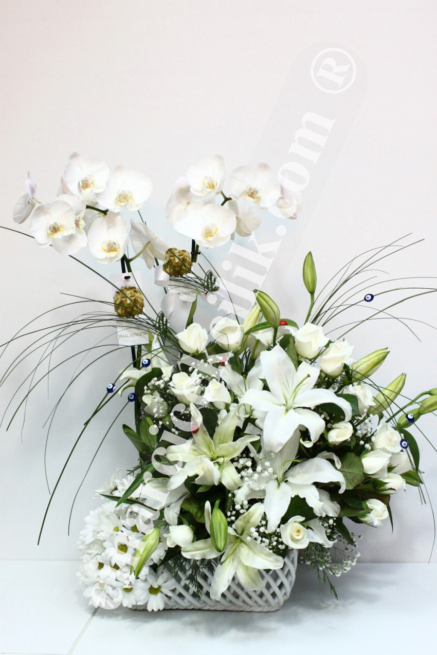 Dünyanın en sevilen çiçekleri arasında birinci sırada olan orkide çiçekleri ile sevdiklerinize inanılmaz bir an yaşatmak ister misiniz? Saksıda iki köklü beyaz Orkide, 15 adet beyaz gül, beyaz krizantem çiçekleri ve kokulu lilyum çiçekleri görenleri kendine hayran bırakacaktır.