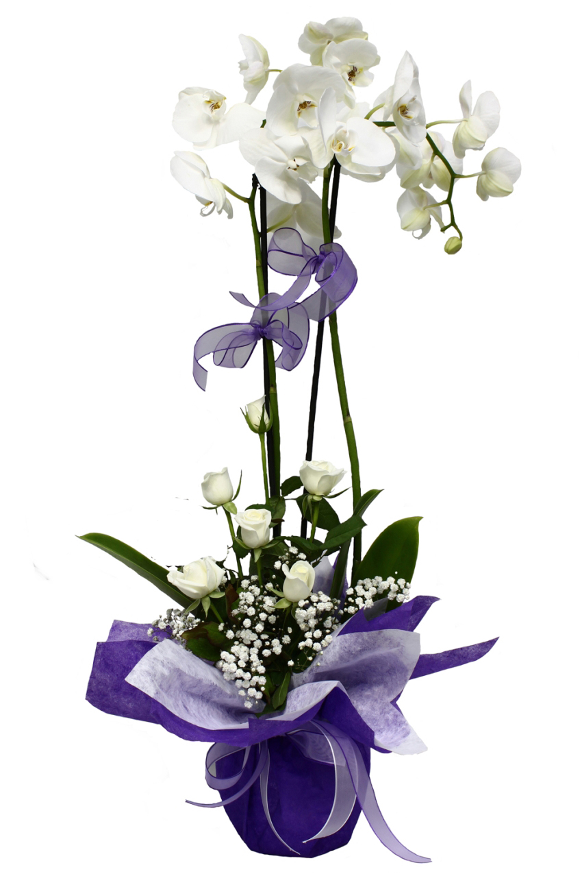 Beyaz Orkide iki kök beyaz orkideden oluşan son derece şık bir saksı çiçeğidir. İki kök Orkideler ortalama 70-80 cm boyunda olup 7 adet beyaz güller ile hazırlanmışış şık bir aranjman. Özel olarak servis araçları ile taşınmaktadır. En ucuz fiyat garantisi ile sunulan bu tek dal orkide ile sevdiklerinize unutulmaz bir an yaşatacaksınız.