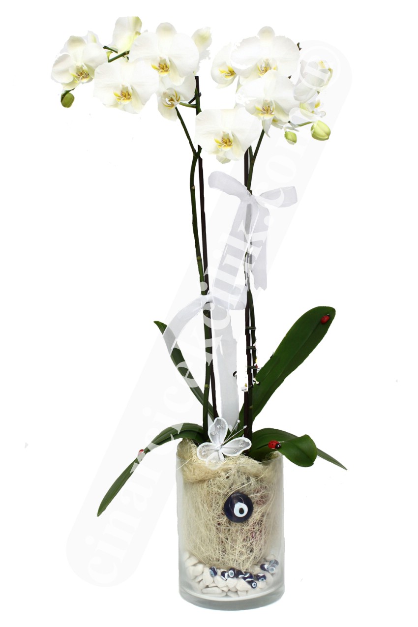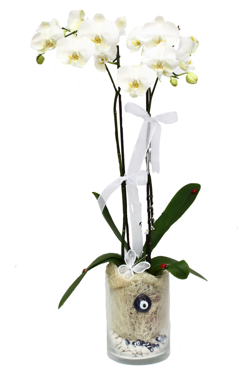 • Dört Kök Beyaz Orkide• Beyaz Orkide Cam Vazo• Nazar Boncuğu