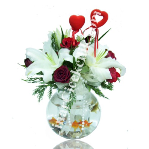 Balıklı çiçek modelleri, birinci sınıf kalitede çiçekler kullanılmaktadır.