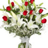 Vazo içinde 9 adet kırmızı gül ve kokulu lilyumlar eşliğinde aranjman. Birinci kalite kırmızı gül çiçekleri ve kokulu lilyum çiçekleri ile hazırlanmış bu büyüleyici vazoda kırmızı gül aranjmanı, sevdiklerinize hediye ederek onlara güzel bir sürpriz yapabilirsiniz.