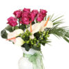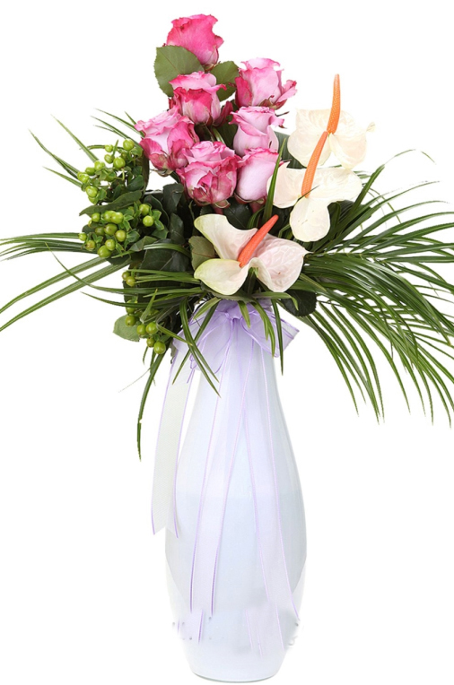 Vazoda 7 Adet Pembe gül Antorium, Birinci sınıf kalitede çiçekler kullanılmaktadır.