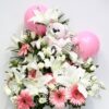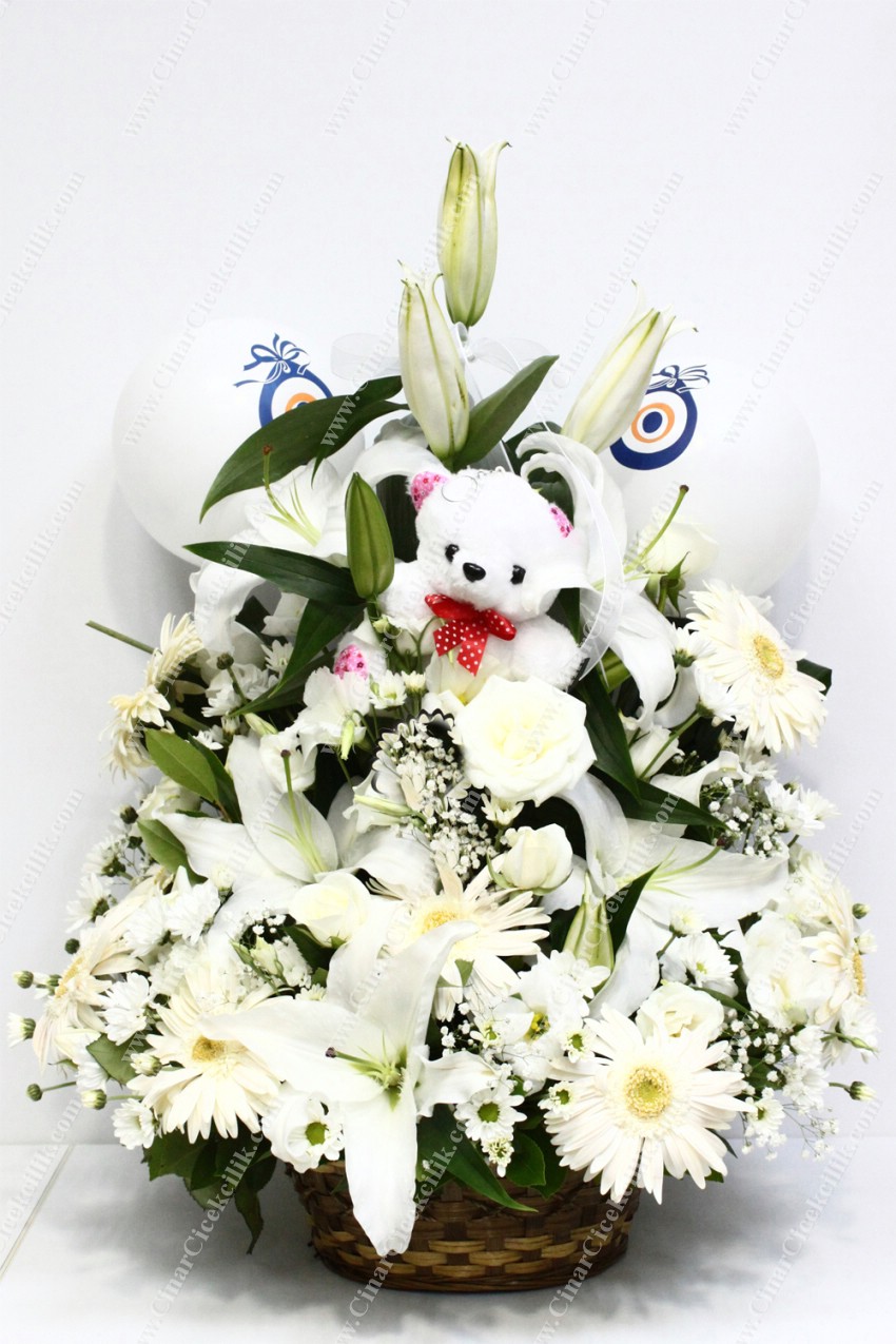 ‘Mutluluğun Görseli’ Pembe Lilyum Gül Çiçek Aranjman. Yaşadığınız bu dünyada seviyor ve seviniyorsanız sizden daha mutlu insan olamaz. İşte bu Sevgiyi bazen kelimelerde ve sözcüklerde ararız. Sözcüklerin bittiği yerde sevdiklerinize en güzel hediye şık örme sepet içerisinde beyaz Lilyum, 11 adet beyaz gül, ve beyaz gerbera çiçeklerinden ve oyuncak ayıdan oluşan şık bir aranjmandır.