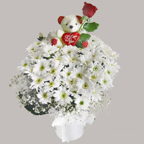 Kır çiçeklerinin ihtişamı ile bu karşı konulmaz güzelliğe eşilik eden oyuncak ayı ile bu güzelliği en güzel biçimde gözler önüne seren bu özel oyuncaklı çiçek özel günlerinizde oyuncaklı çiçek siparişi için birinci kalite çiçekler kullanılarak, ayıcıklı kır çiçekleri siparişi verip, oyuncaklı kır çiçekleri gönder menin keyfe dönüştüğü çiçekçi.
