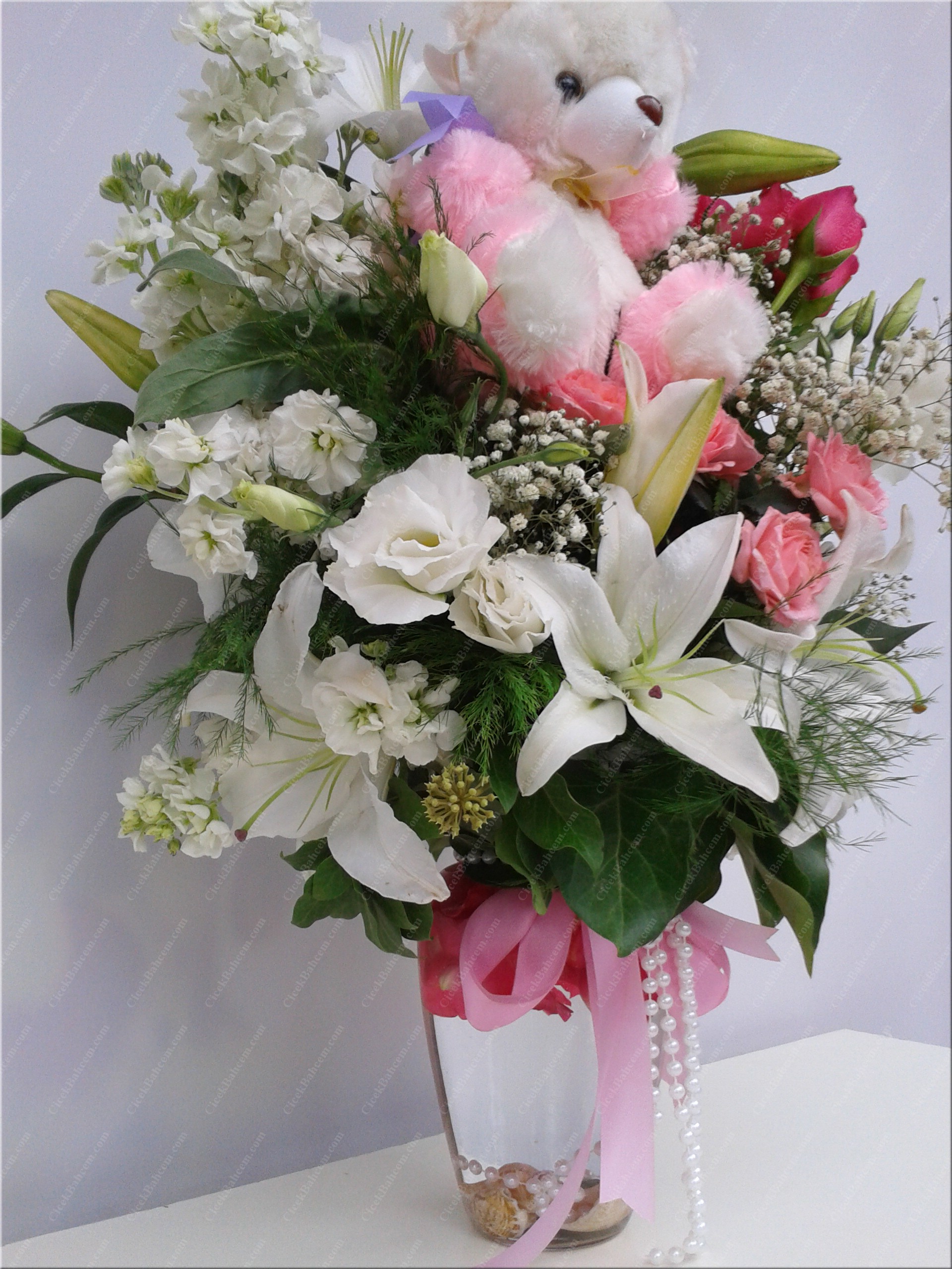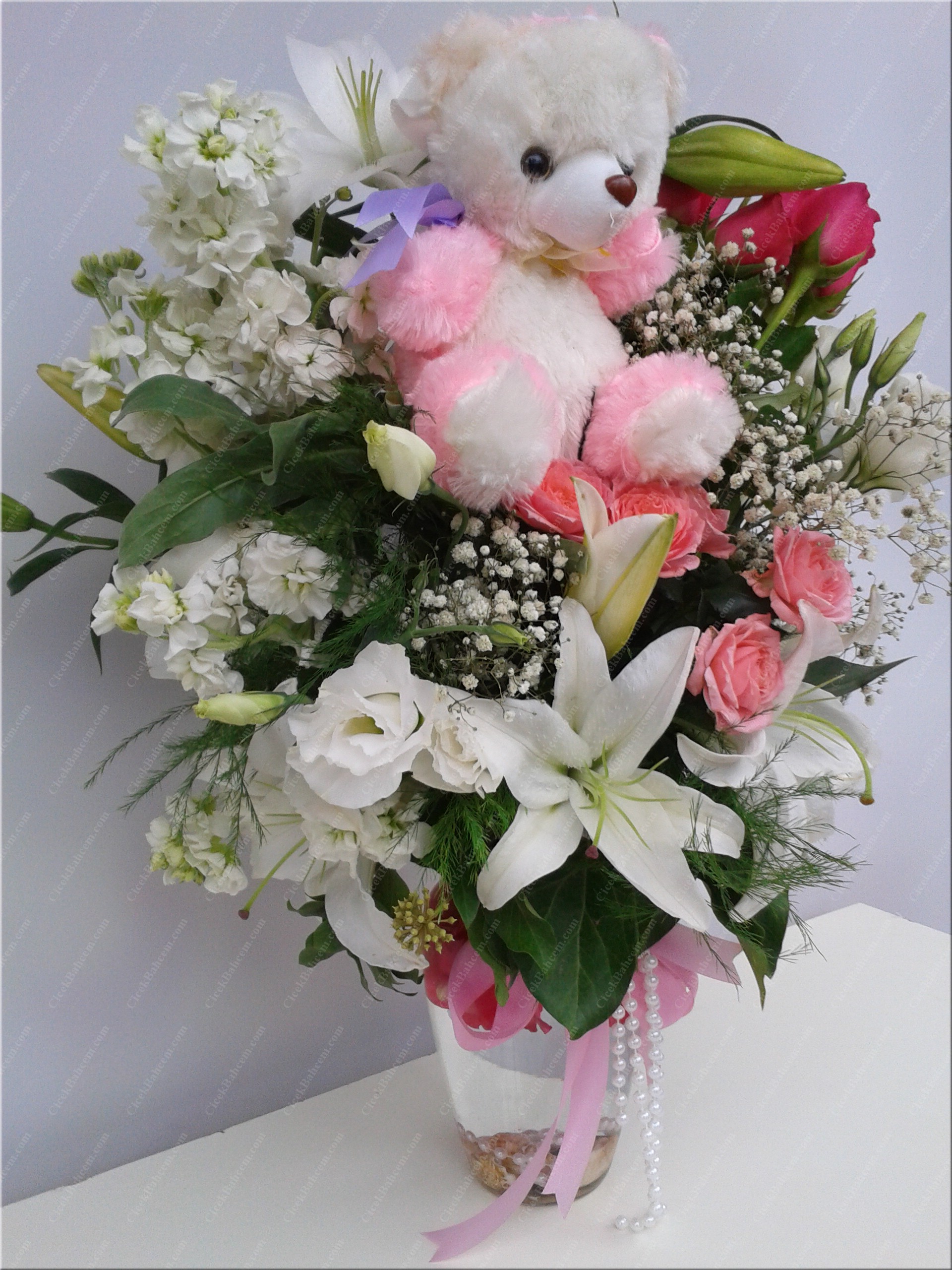 Ayıcık, güller ve lilyum çiçekleri gibi, mutluluğu en saf hali ile sizlerin en özel günlerinizde yanınızda olmaktan mutluluk duyarız. Birinci sınıf pembe gül, lilyum çiçekleri ve ayıcık eşliğinde özel olarak hazırlanmış oyuncaklı çiçekler.