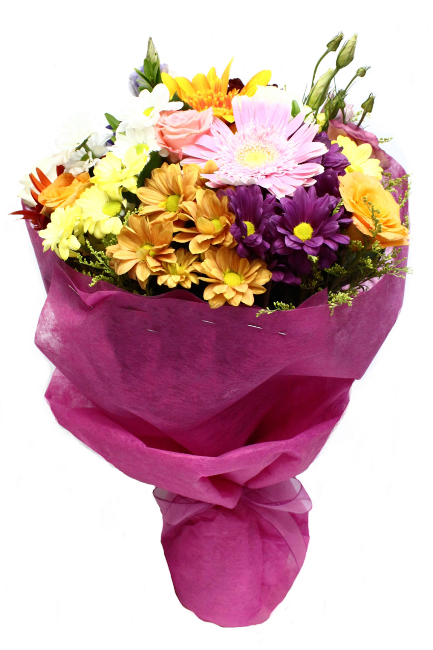 Pembe saten içinde renkli 3 adet gül renkli papatya (krizantem) çiçekleri ile hazırlanmış kır buketi. Birinci kalite renkli papatya ve renkli 3 adet gül ile hazırlanmış bu büyüleyici kır buketi, sevdiklerinize hediye ederek onlara güzel bir sürpriz yapabilirsiniz.