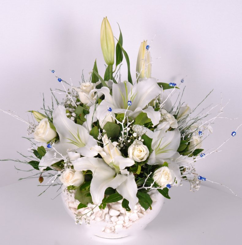 ‘Sevgi Seli’ Beyaz Gül Lilyum Aranjman. Yaşadığınız bu dünyada seviyor ve seviniyorsanız sizden daha mutlu insan olamaz. İşte bu Sevgiyi bazen kelimelerde ve sözcüklerde ararız. Sözcüklerin bittiği yerde sevdiklerinize en güzel hediye şık vazo içerisinde beyaz kokulu Lilyum, 11 adet beyaz gül çiçeklerinden oluşan nazar boncuklu şık bir aranjmandır.