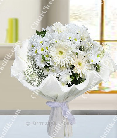 Beyaz gerbera çiçeklerinin ihtişamı ile bu karşı konulmaz özelliği beyaz krizantem ile bir adım yukarı taşıyın. Bukette kullanılan bu iki özelliği en güzel biçimde gözler önüne seren bu özel buket özel günlerde çiçek gönderimi için birinci kalite kır çiçekleri, sevdiklerinize buket siparişi verip, buket gönder menin keyfe dönüştüğü çiçekçi.