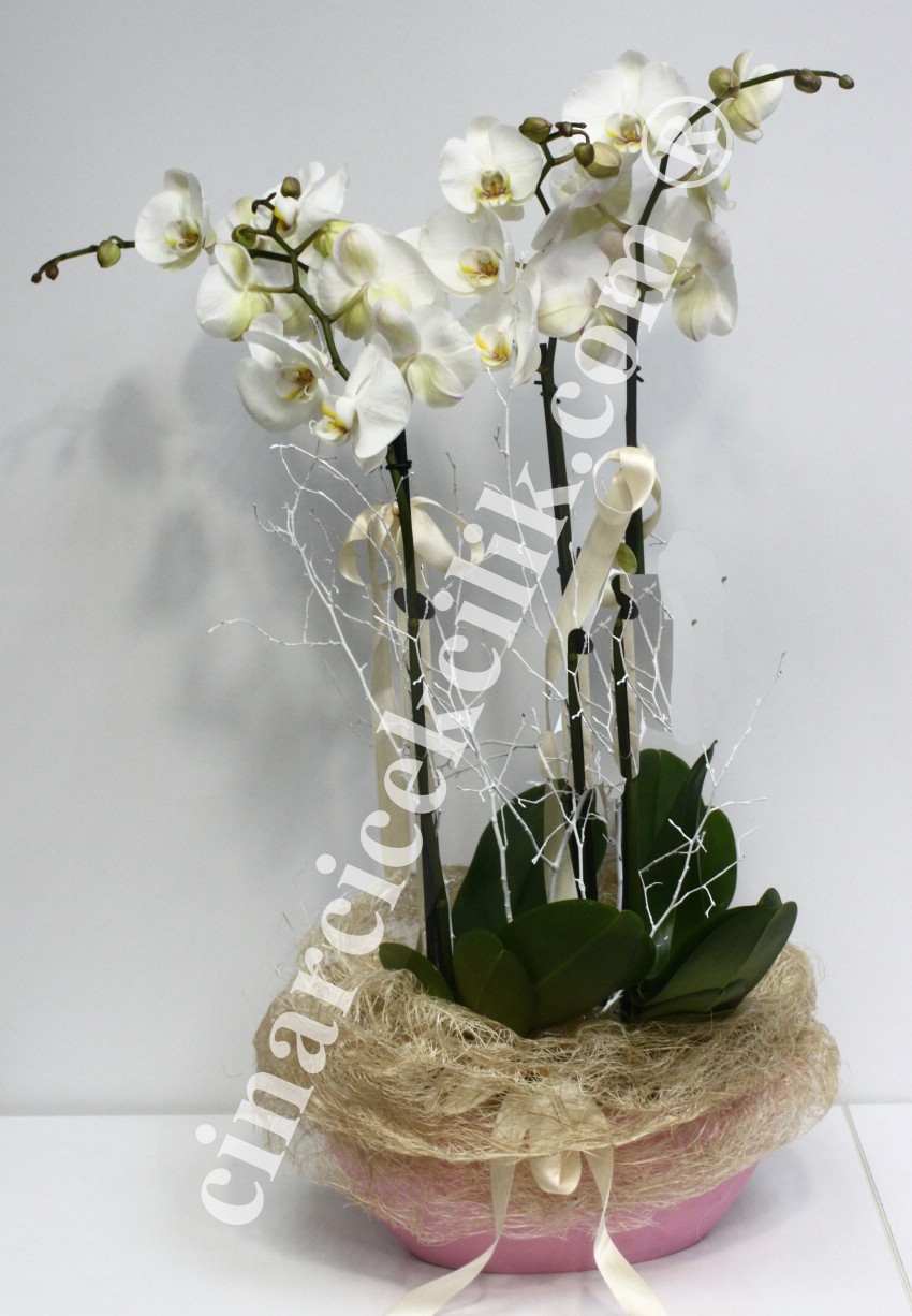 Kullanılan saksılar 15 cm ila 20 cm çapında olarak değişiklik göstermektedir. Saksıda beyaz Orkide görenleri kendine hayran bırakacaktır.
